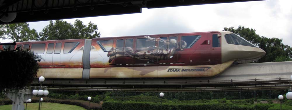 The boys headed to Thunder Mountain. Kelli and I needed a more relaxing day so we did Peter Pan with our fastpasses and then walked right into Mickey's PhilharMagic. We started to head out, but watched some of Move It! Shake It! Celebrate It! Street Party and did some shopping along Main Street. While waiting for a bus I got a picture of the new Iron Man 3 Monorail. Tim and Marissa caught up with us at the bus stop; each carrying a Disney Starbucks iced coffee. Kevin headed for Space Mountain for one last thrill.