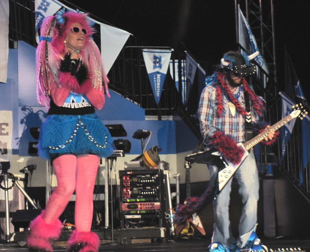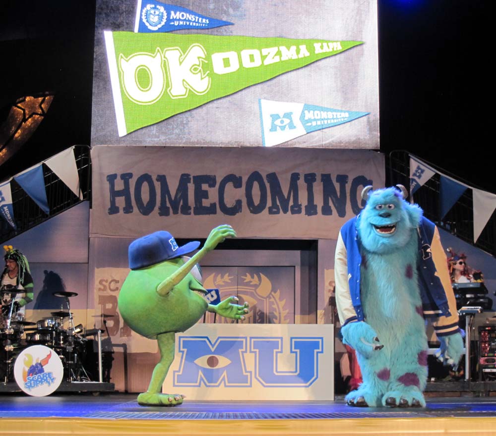 After that the Fantasmic! group headed on over for the show. Kevin and I used our now current fast passes for another ride on Tower of Terror. Before heading out, we watched some of the Monsters University Homecoming Party featuring a live band called Scare Supply. Mike and Sulley came out along with the Monsters University Cheerleaders for a few songs. We left after they finished the Monster University Fight Song.