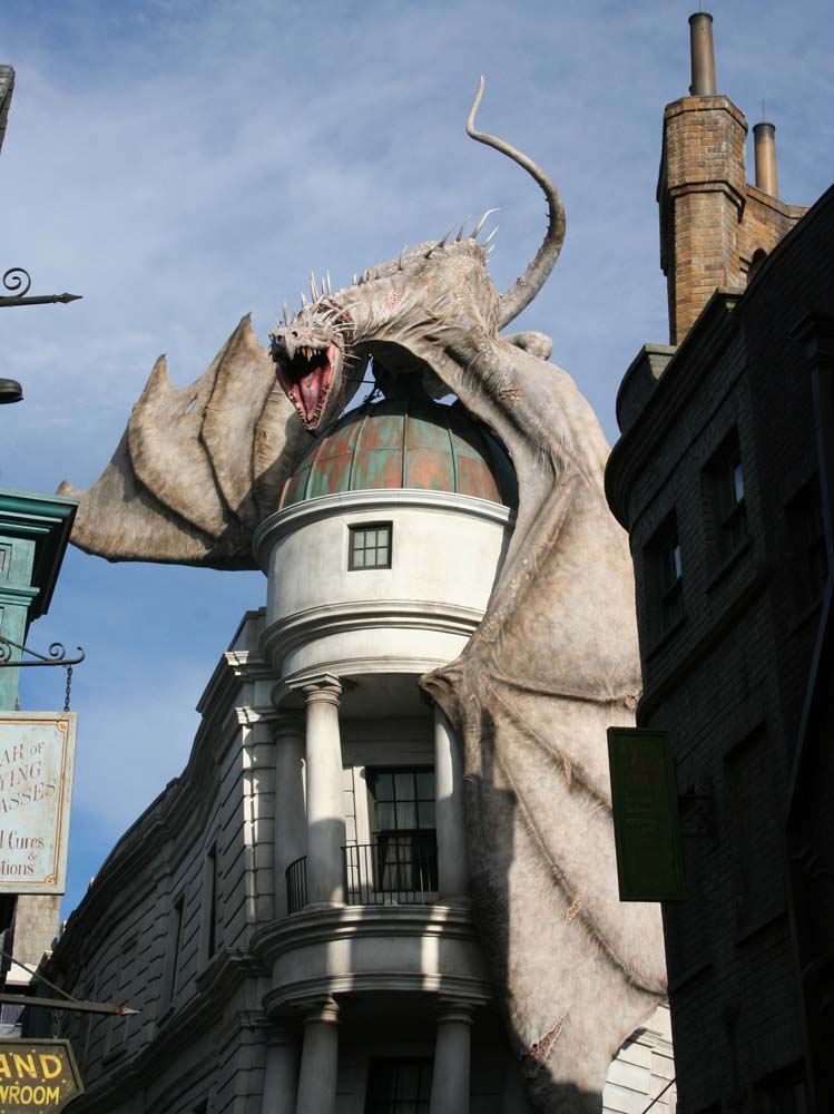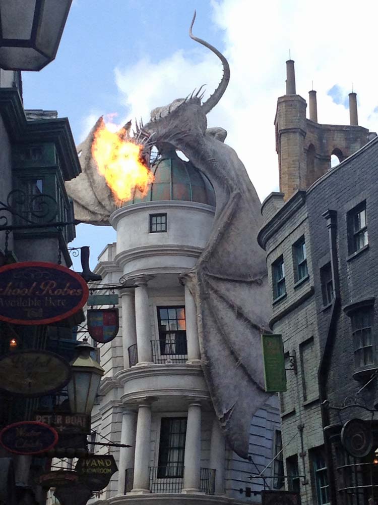It took a few moments outside to find Kelli, I took that time to get pictures of the dragon atop Gringotts spewing fire.