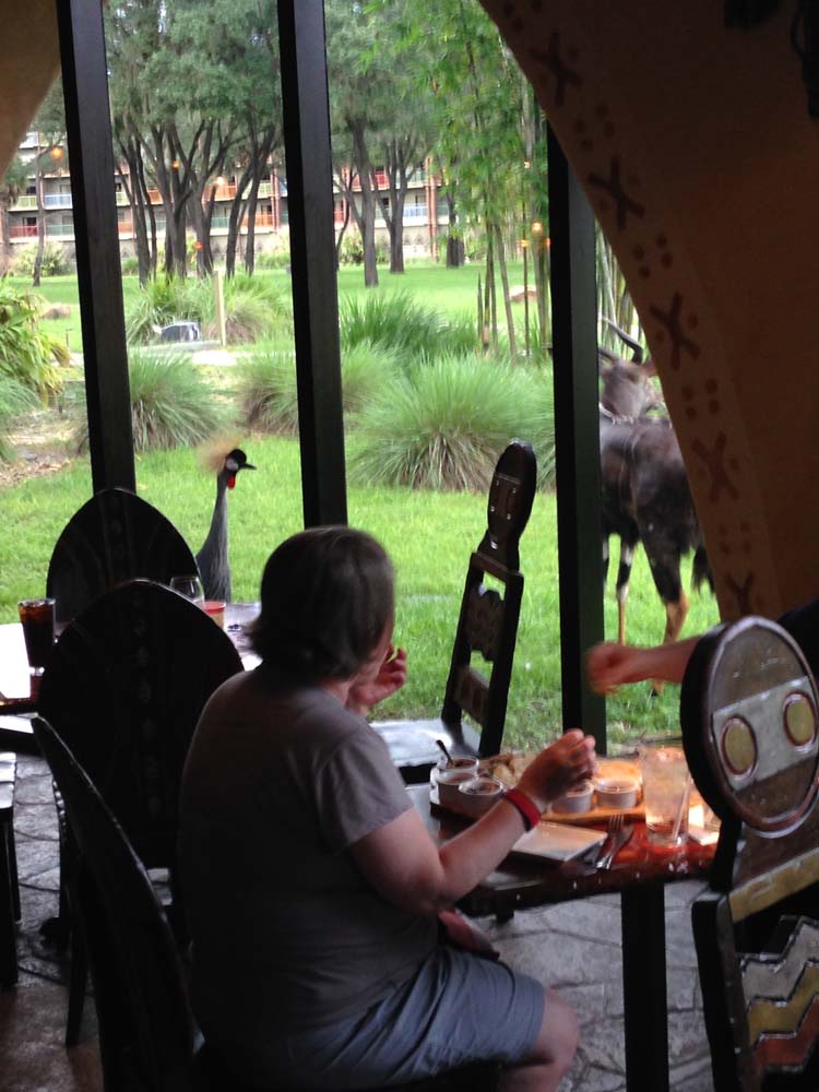 While waiting for our entrees a West African Crowned Crane and an antelope called a Sitatunga or Marshbuck showed up at the windows.