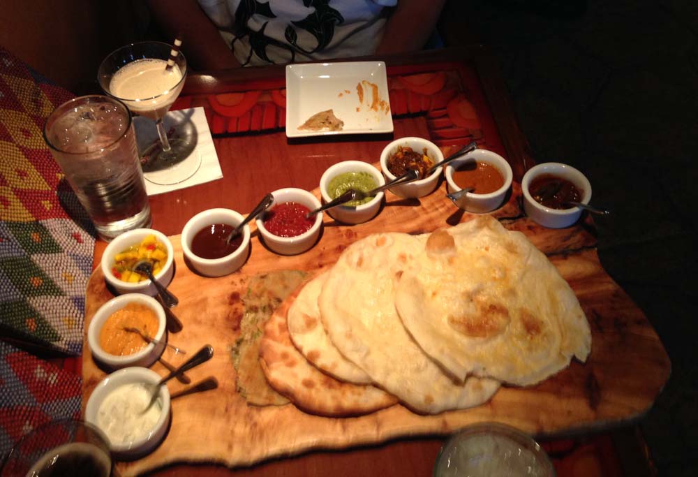I had a Safari Amber draft and Kelli had another Godiva Martini. We shared the Indian-style Bread Service, 5 breads and all nine accompaniments. The breads were traditional naan, garlic-ginger naan, spiced naan, onion kucha, and paneer paratha. The dipping sauces were arranged in increasing spiciness, Cucumber Raita, Roasted Red Bell Pepper Hummus, Mango Chutney, Red Chile Sambal, Tomato-Date Jam (similar to a spicy ketchup), Coriander Chutney, Garlic Pickle, Tamarind Chutney and Spicy Jalapeño-Lime Pickle. All were good. Some were even better when combined, like the Cucumber Raita with the Spicy Jalapeño-Lime Pickle.