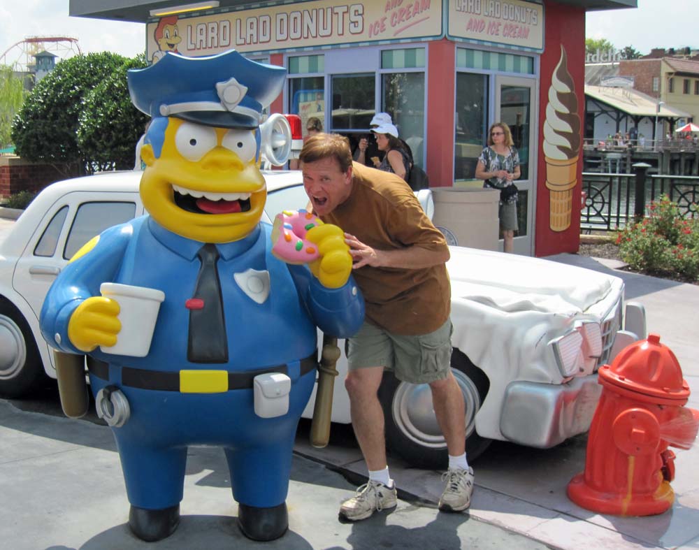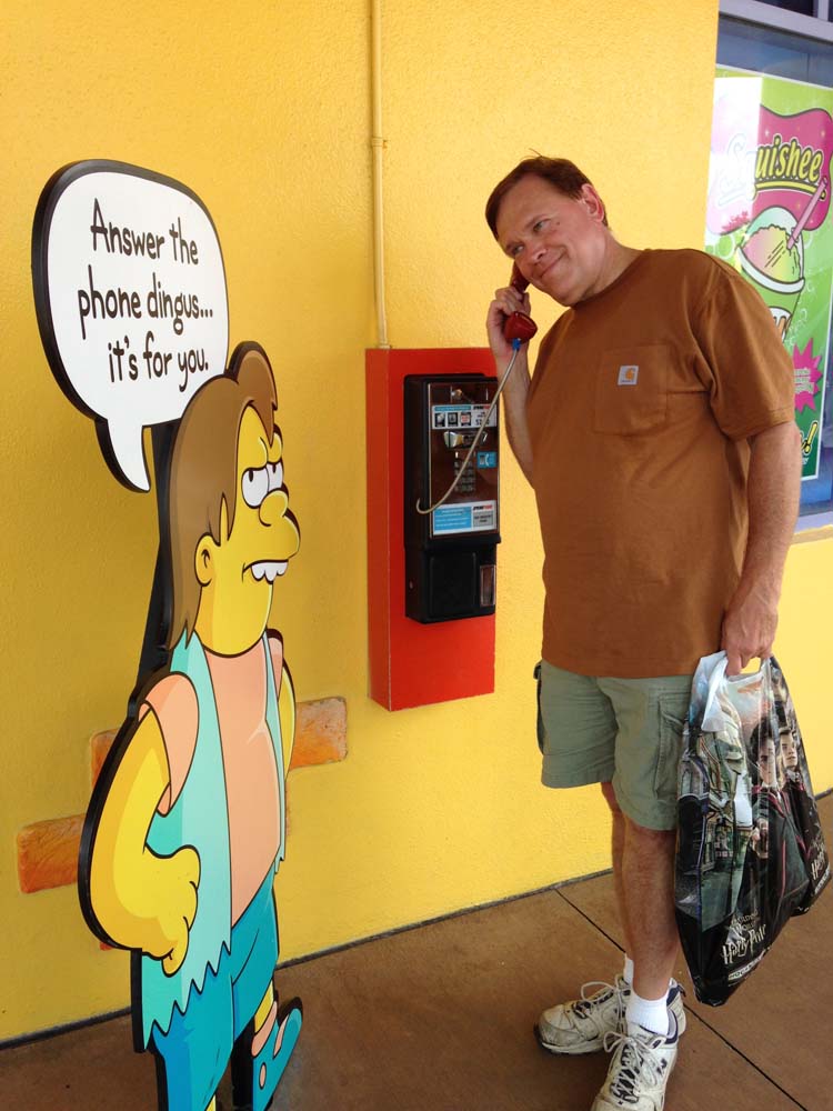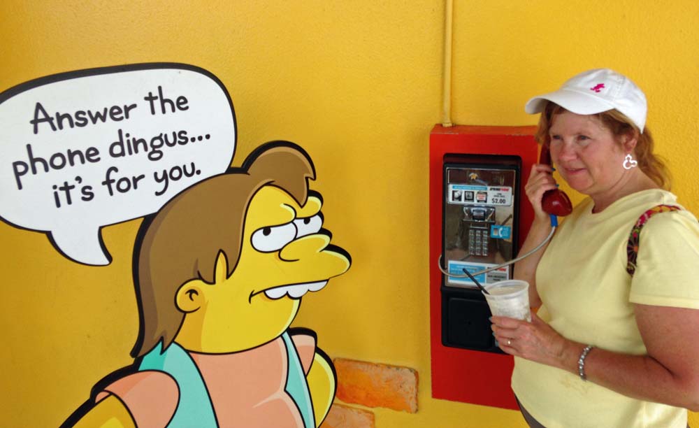 We were getting tired from our travel so we headed out. I did do the Simpson Ride, getting right on with the Express Pass. Things happen fast and furious on this ride and it was enjoyable to pick up new things I missed on my previous ride from a couple of years ago. I found Kelli sitting outside, near where the phone is, just outside the Quickie-Mart. When it rang we each took turns picking it up and listening. On the other end for me was Professor Frink looking for some radioactive material he lost. Kelli got Ralph looking for his police officer dad.