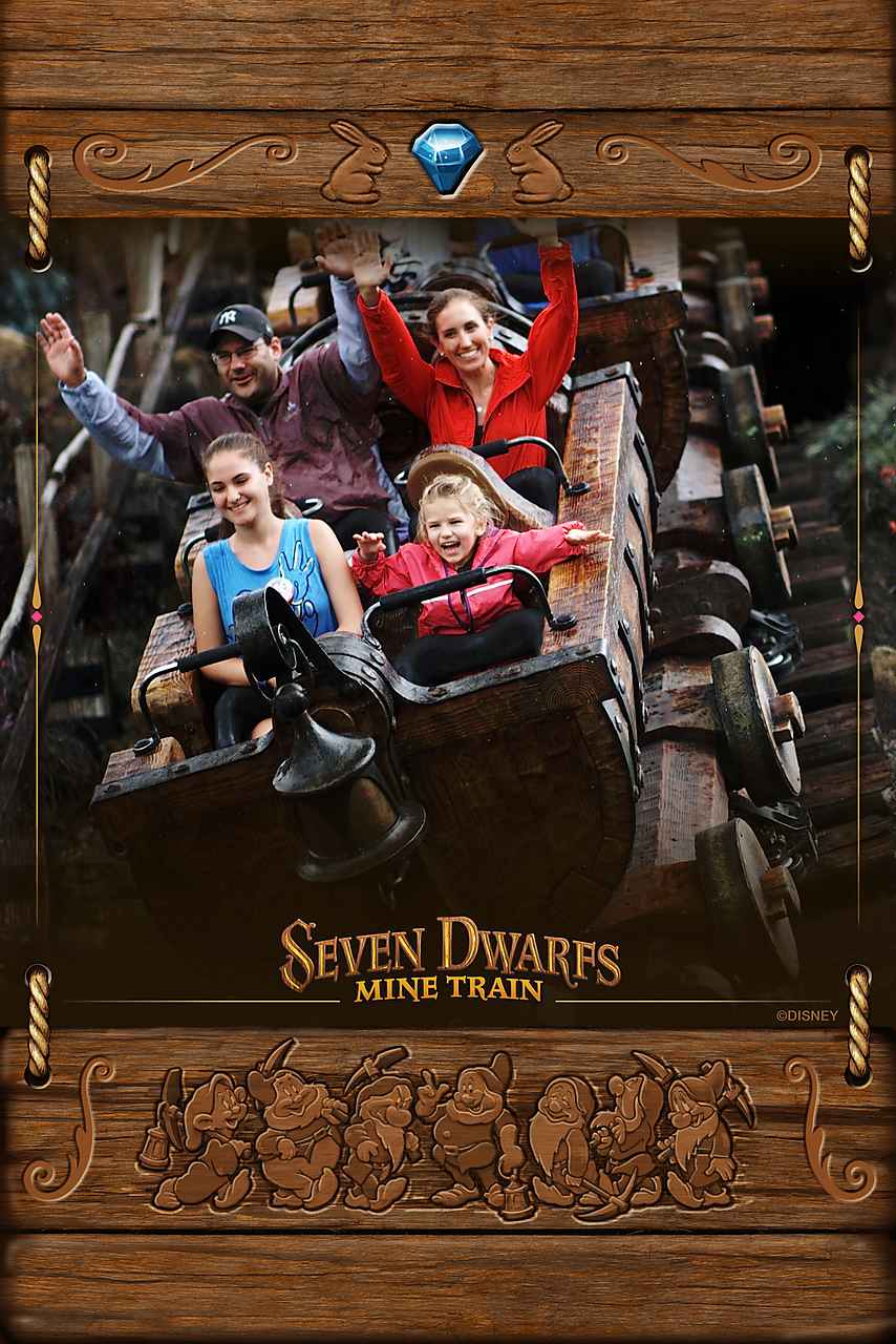 Meanwhile the rest of the group had Fastpasses for Peter Pan's Flight. Maddie met with Cinderella and Princess Elena of Avalor. Marissa and Maddie did the zoom photo in front of the castle while Sam and Little Rich rode Space Mountain as others waited to see Disney Festival of Fantasy Parade. Ann and Little Rich noted how hot their feet got watching the parade. After that, some rode Buzz Lightyear followed by the Mine Train. Ann watched Liam as Maddie sat with Sam on the front car of the Mine Train. I think this may be Maddie’s favorite coaster now.