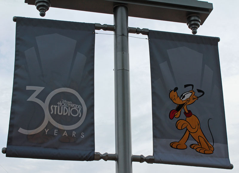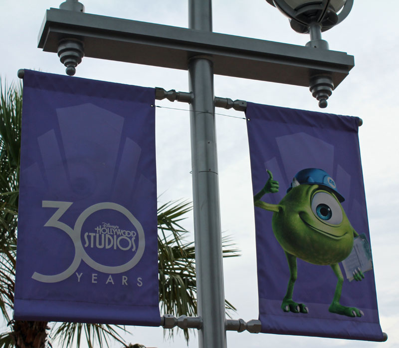 Some people headed to Starbucks and shopped while Little Rich, Sam, Kelli and I went to the Tune in Lounge for a chocolate and two PBJ milk shakes. We all left the park at 4:45. Liam was on top of Tim’s shoulders waving and saying goodbye to everyone coming in. I noticed the 30th Anniversary of Hollywood Studios banners with different characters on each lamppost.