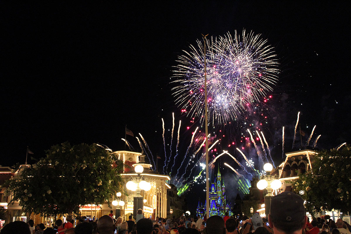 We were stuffed. The TiW saved $88.58. We waited for the boat back to the Magic Kingdom while Joan and Rich took the kids back to the room by bus. It was a long wait for the boat. People in front of us ended up waiting nearly an hour. They were on a guided tour. We all made it onto the boat and it was quickly nearing 9 pm. I thought we would miss the fireworks. Security was great, working quickly and efficiently to get everyone through and we just made it to the foot of Main Steer to see the Happily Ever After fireworks. The coolest fireworks were a couple that formed large dragonflies during the Princess and the Frog sequence.