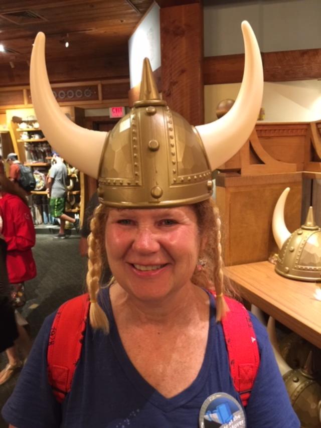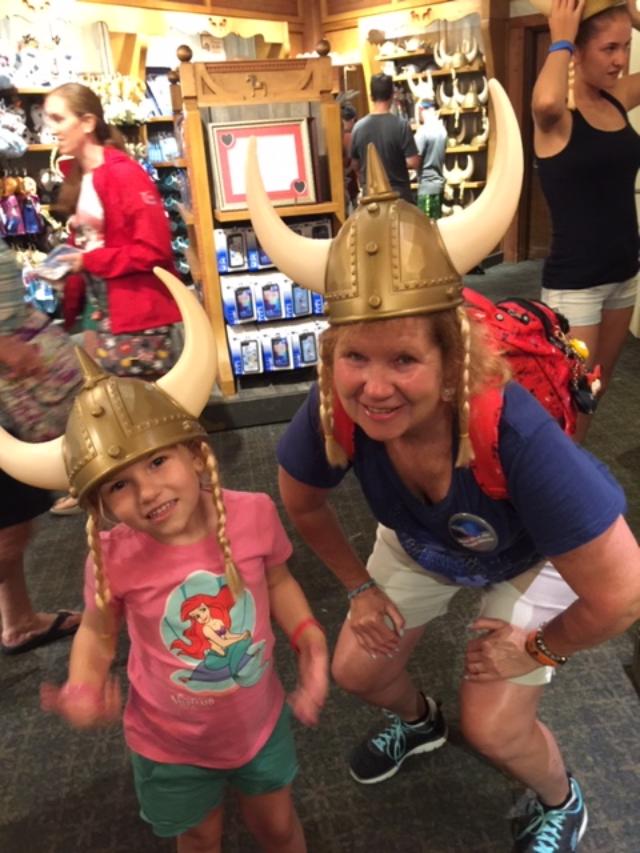 We headed back into the park with Kelli eyeing some foam pink and blue swords in Canada that she thought Maddie would enjoy playing at our house. We waited in Norway for Maddie and Liam to finish their meet and greet with Anna and Elsa before all of us riding Frozen Ever After with FastPass. In the merchandising experience (aka gift shop) after the ride, Maddie and Liam had fun trying on Viking hats and playing with foam swords and shields.