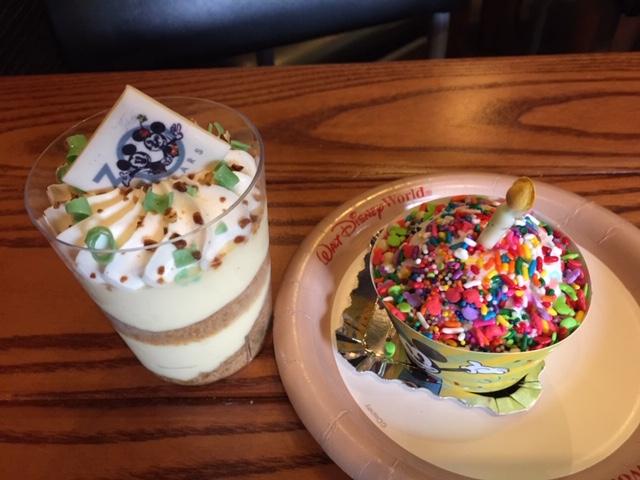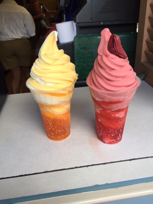 Kelli and I wanted to try some of the new Dole Whips. At Sunshine Tree Terrace we tried; Redd’s Revenge, Strawberry dolewhip with Fanta Strawberry and chocolate pirate hat and an Orange Dole Whip float.