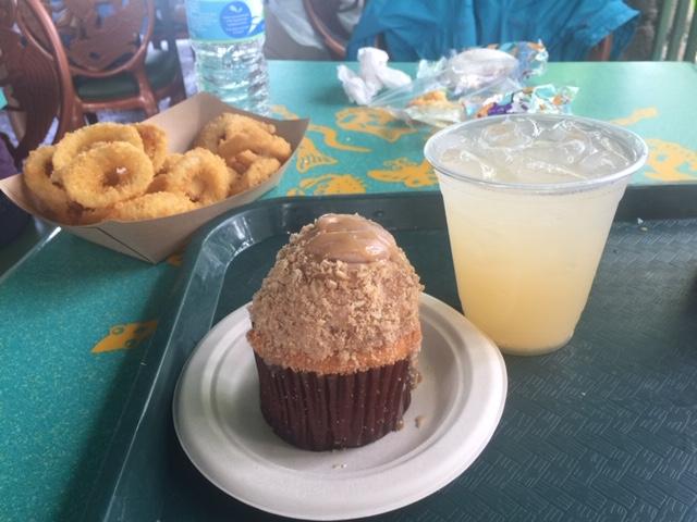 We ate our packed lunches at the topmost area of Flame Tree Barbeque. I had my second drink of the day, a Mandarin Orange Vodka Lemonade. It featured Skyy Mandarin Orange Vodka with ripe flavors of Tangerine and Lemon Zest. I also shared an Onion Ring Basket and a Salted Caramel Apple Crisp Cupcake with Kelli. The vanilla cupcake had apple pie filling, caramel buttercream, salted caramel drizzle, streusel crumbs and a house-made apple chip. It was the BEST cupcake of trip.