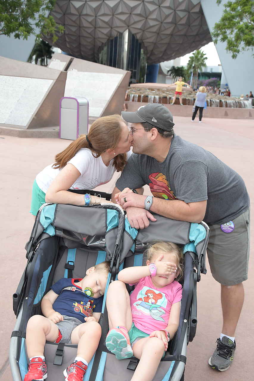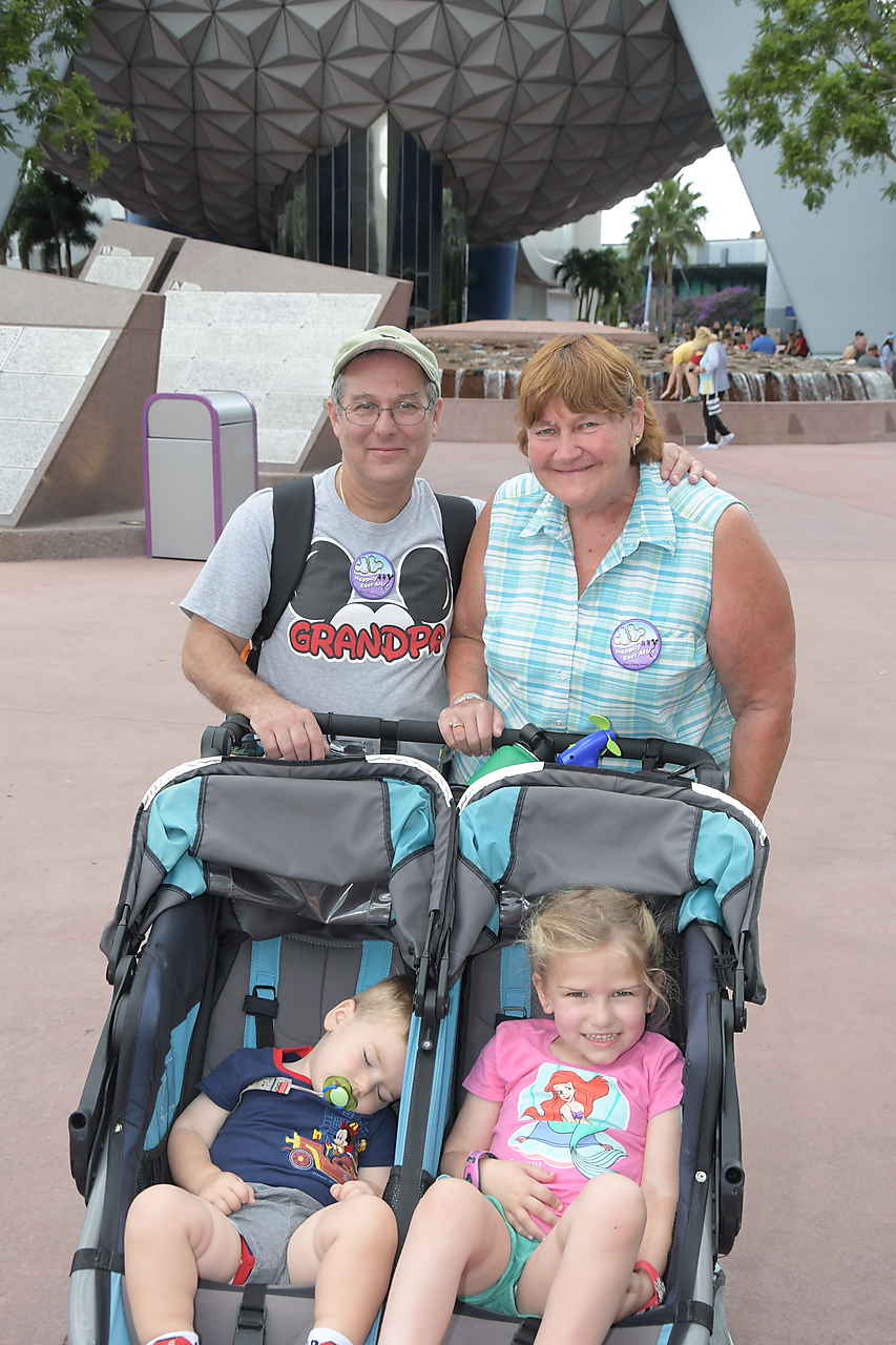 Today we all headed to Epcot and got there well before opening. They let people in early up to the base of Spaceship Earth. Ann and Sam took some pictures by the fountain.