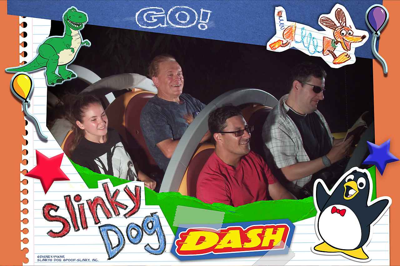 We split up; half have FastPass for Slinky Dog Dash and Kelli and Ann rode Alien Swirling Saucers. On dash with Sam, Little Rich and myself, a fourth passenger posed as if reading a book.