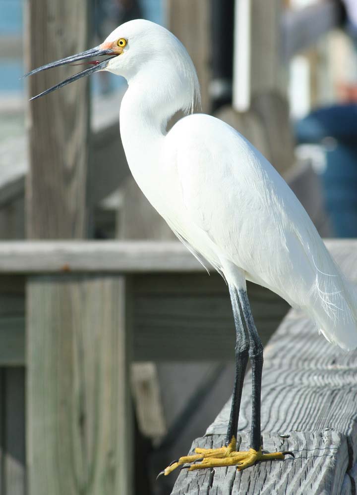 Florida abounds with egrets and herons. Most will encounter a Great Egret, a tall all white bird that can even be found atop a Turkey Leg kiosk in the Magic Kingdom or at the resorts, prowling the bushes for lizards to eat. A few are likely to be present in any body of water. They have yellow bills and black legs and feet.