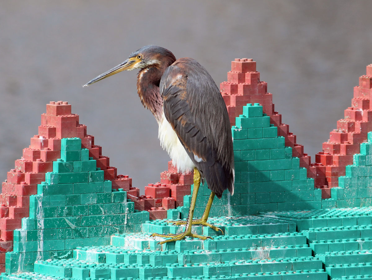 Tricolored Heron atop the Lego serpent at Disney Springs