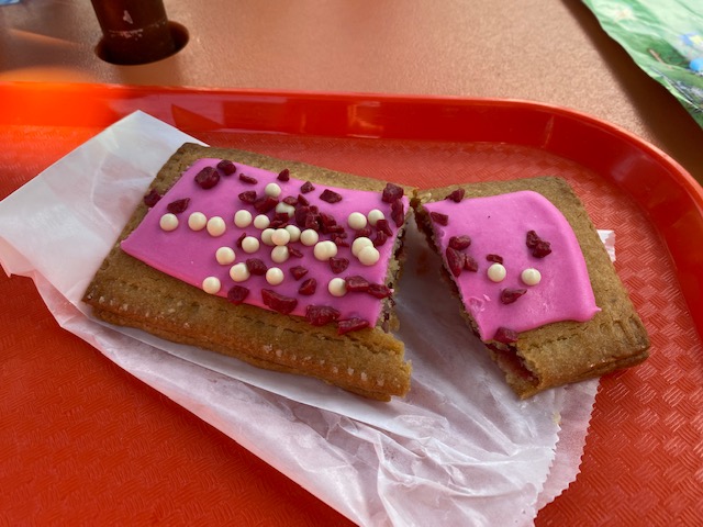 Kelli and I were looking forward to trying the Seasonal Lunch Box Tart at Woody’s Lunch Box. We did the mobile ordering and it was ready very quickly. It was raspberry and was as good as it looks. We also brought some Babybel cheeses for a snack.