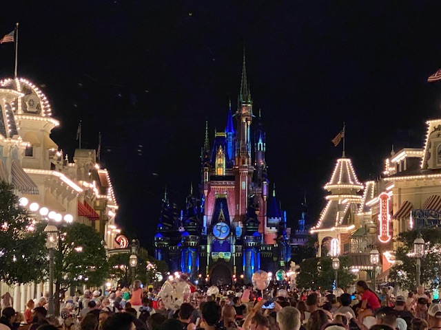 We were tired so we staked out a spot in front of the flagpole at the base of Main Street for the Happily Ever After fireworks show. We had some ground to sit down on and a fence to sit or lean against. Kelli and I enjoyed people watching and relaxing for the 50-minute wait. We did see someone get engaged near us.