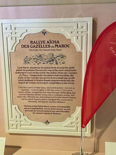 We stopped in the Moroccan Pavilion and looked at the exhibit called “Race Against the Sun” It showcases two incredible modern-day competitions. One is Marathon des Sables (Marathon of the Sands) and the other is Rallye Aïcha des Gazelles du Maroc (Rally of the Gazelles), a women’s only car race. The exhibit also showcases the rich history of the ancient inhabitants of the Sahara, the Berbers.