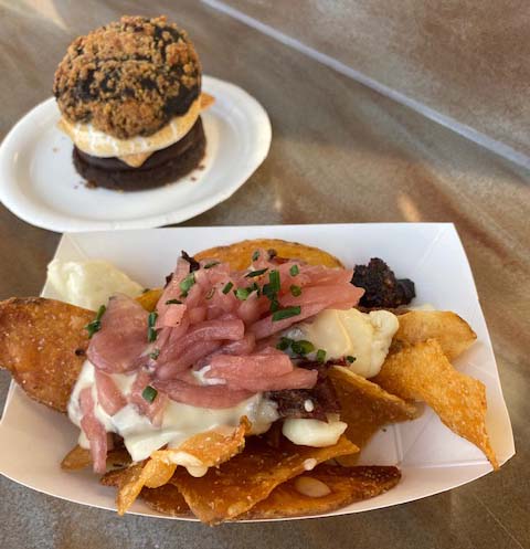 We stopped at the Funnel Cakes kiosk for their special Food and Wine Mini Candied Bacon-S’mores Funnel Cake, topped with vanilla ice-cream. It was OK, not as delicious as we hope for.