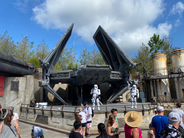 Thank god the area and the queue are amazing with detail. A guy next to us points out the mini Millennium Falcon hidden beneath the huge one we are standing next to.
