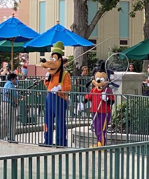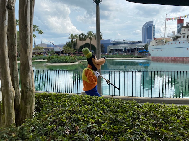 We waited outside the restaurant for everyone to gather and spot Goofy and his nephew Max walk by and start fishing the lake. They end up catching a rubber boot and a rubber chicken!