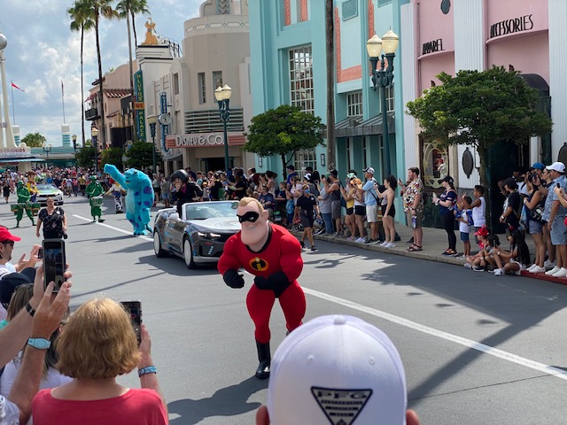 The Incredibles caravan with Mr. and Mrs. Incredible, Edna Mode in a car followed by Sully, Green Army Men, Buzz and lastly Woody and Jesse drove by.