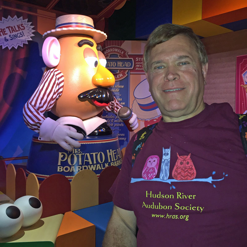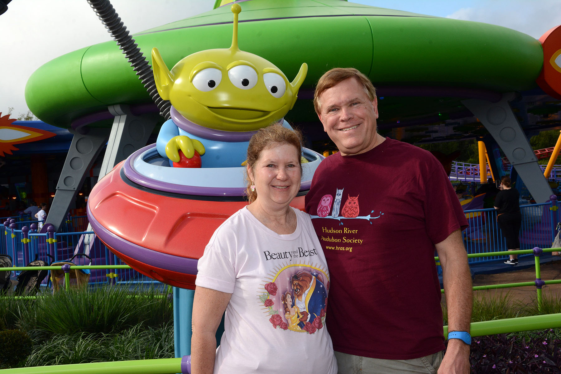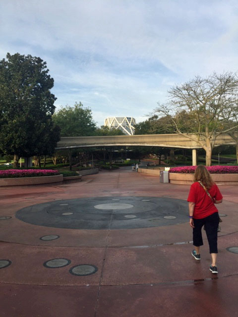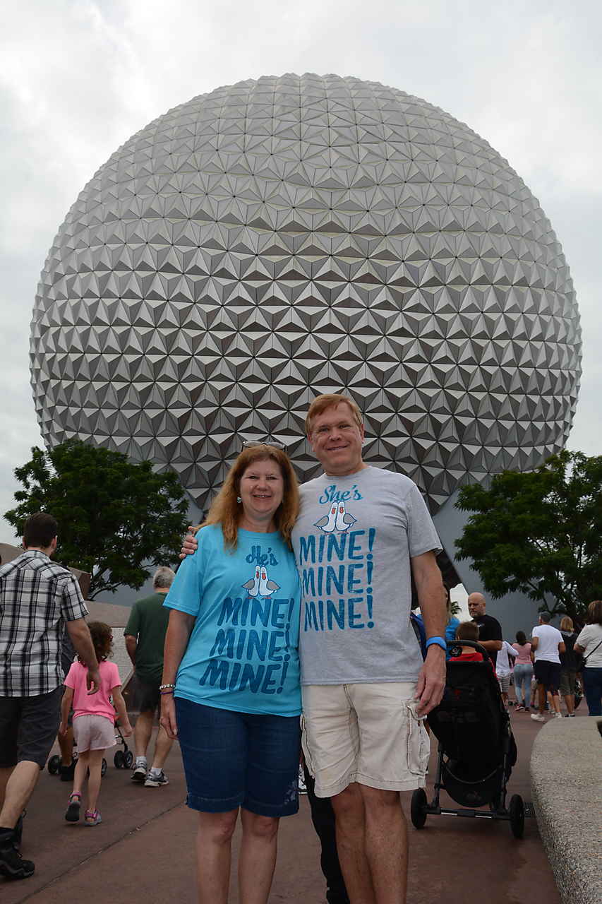 We woke early around 6:30 AM, made coffee and enjoyed a short time on the balcony. On the way to the bus we heard a Yellow-bellied Sapsucker in a nearby tree but did not see him. We caught a bus at 7:30 to get to Epcot before 8. We found the entrance line that lets you in early if you have a breakfast dining reservation and took a quick picture in front of Spaceship Earth.