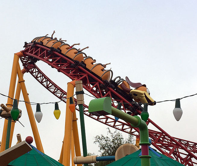 I almost grabbed a snack at the counter service that looks like a tipped over lunch box but the line was too long. We saw the new Slinky Dog Coater take off, can’t wait to actually ride it in February.