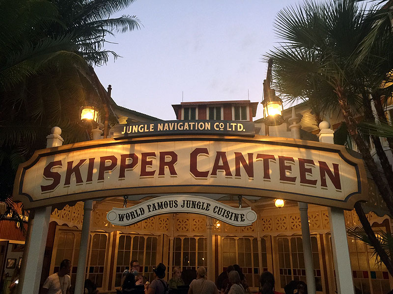 For dinner we had to cross the park to get to our 6:15 PM ADR for the Navigation Co., Ltd. Skipper Canteen. This new sit down restaurant featured a funny staff. When I asked where the restrooms were they said – go through the bookcase and 3 miles back. They also pointed out the highlights of the restaurant – the ceiling lights.
