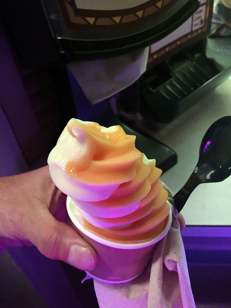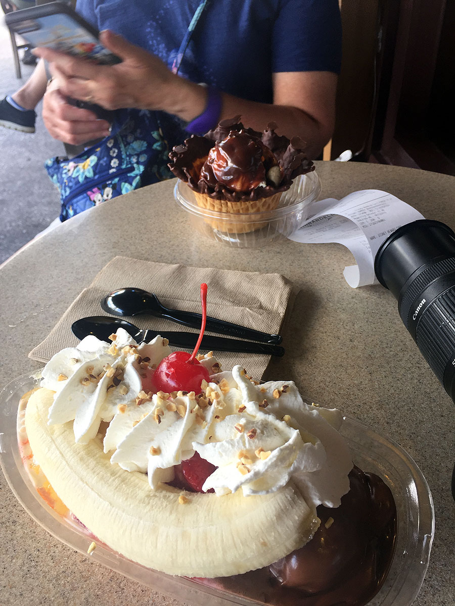 The Tiki Room didn’t look crowded so we did that, followed by a vanilla and chocolate cone and an orange and vanilla Dole Whip from Sunshine Tree Terrace. We found a quiet spot to sit behind a kiosk and were visted by another brave squirrel at our feet.