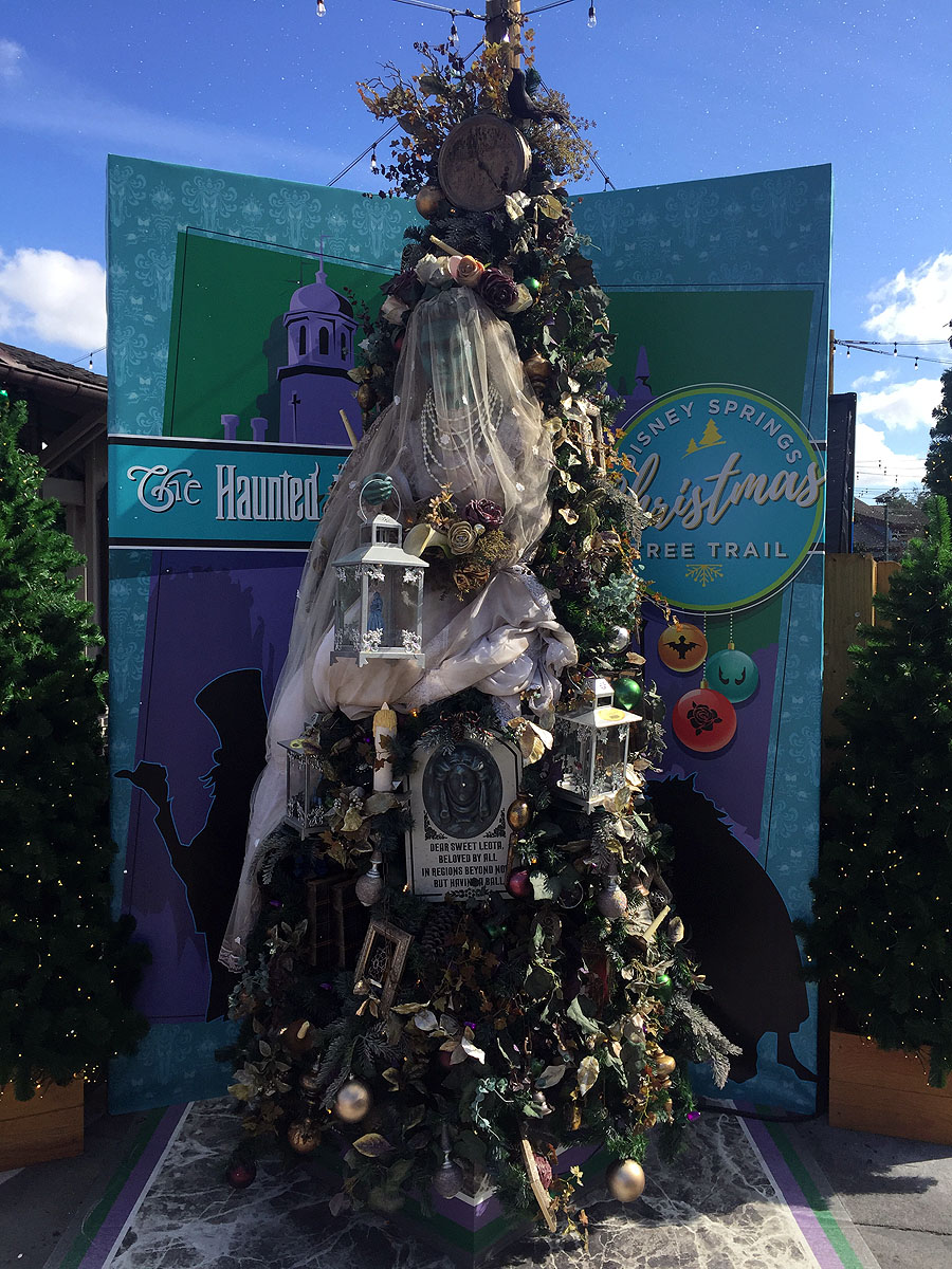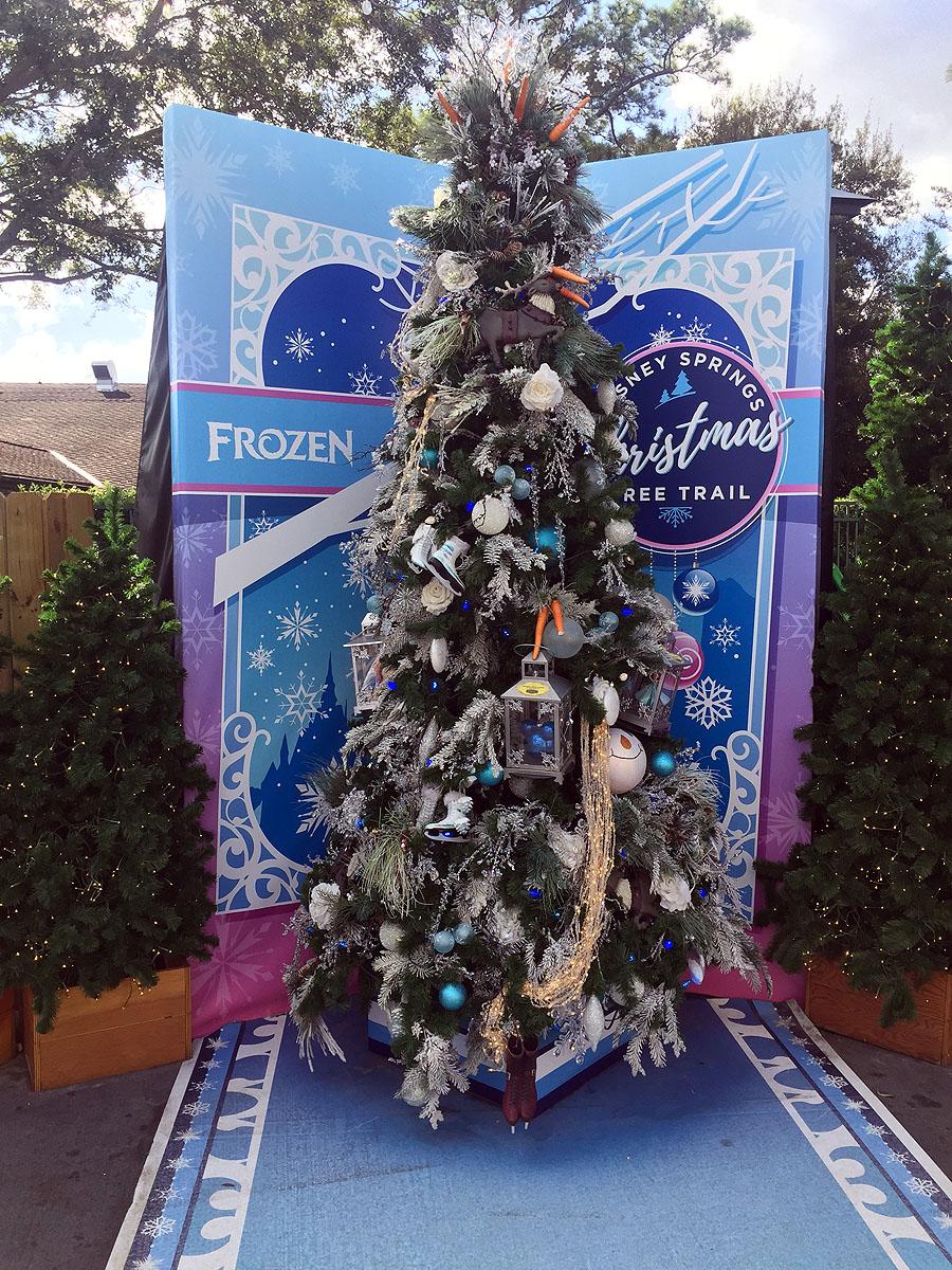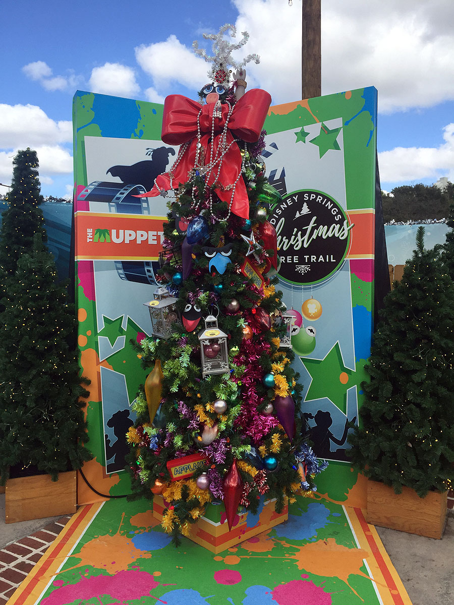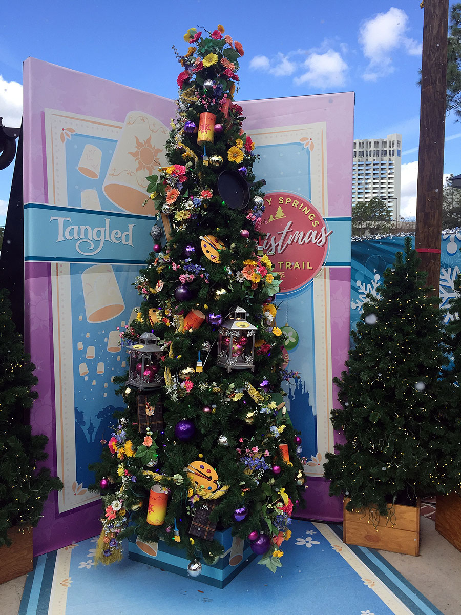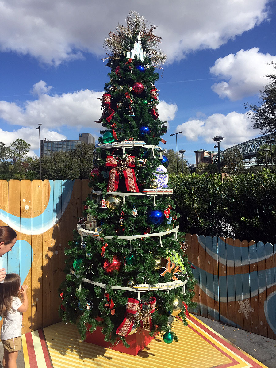 We walked over to Disney Springs to the Christmas Tree Trail. The location is where the old bus depot off East Buena Vista Drive used to be. It features 27 Christmas Trees decorated by a Disney theme. Some examples are Toy Story, Frozen, The Muppets, Tangled (with a frying pan in the tree), and Haunted Mansion. My favorite was the Monorail themed tree.