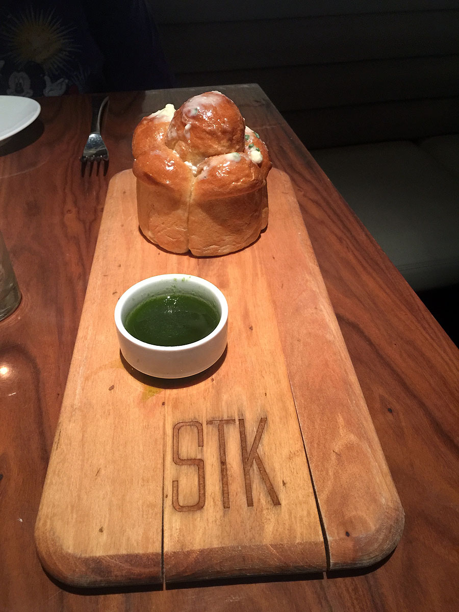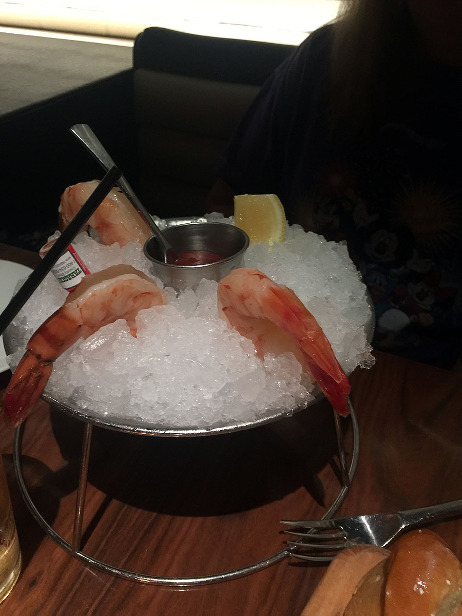 Our dinner tonight was at a new steak place called STK back in Disney Springs. We arrived on time for our 5:30 PM reservation. The restaurant played a lot of 80’s rock. Blue-cheese butter bread was served with a chive sea salt oil. Appetizers were Crispy Rock Shrimp with chili remoulade and Shrimp Cocktail with 3 gigantic shrimps. We both had the 6 oz filet; I had the Béarnaise and Kelli the STK sauce. We shared a side of Sweet Corn Pudding.