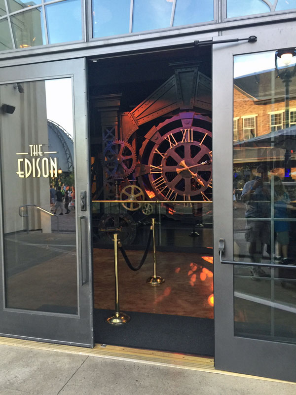 Tonight’s dinner was in a new Restaurant called the Edison in Disney Springs at the site that used to be the Adventures Club. Themed like an early-1900s power plant and named after the inventor Thomas A. Edison. The restaurant shows late 19 and early 20th century silent movies on the wall. Thomas Edison’s company not only built the apparatus for filming and projecting motion pictures, but also produced films for public consumption.