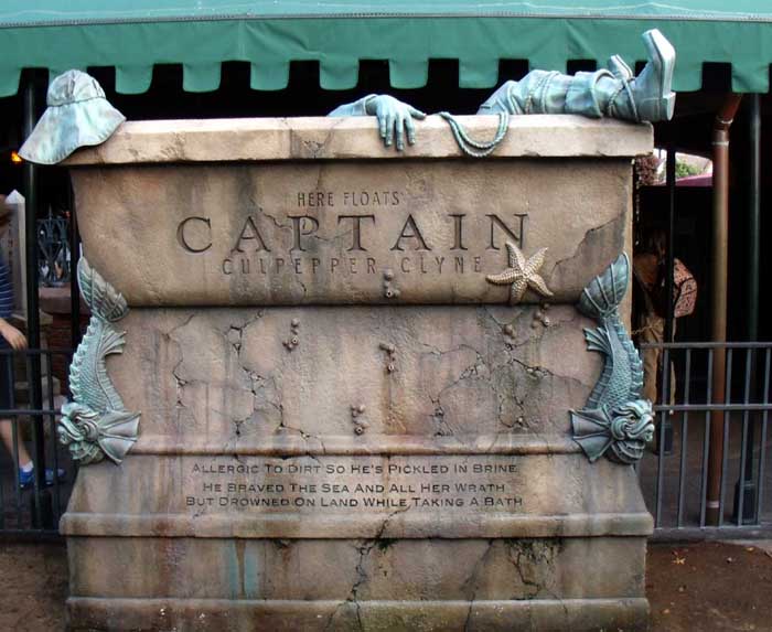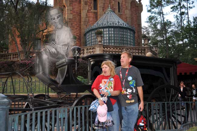 We then headed for the Haunted Mansion. We explored the new queue with all the interactive headstones. I wasn’t paying attention at one point and the captain got me with a squirt of water. My favorite was where you had to complete the poetry, just before merging with the old queue. The ghost would recognize your voice if you had the right answers. The end of the ride with the hitch hiking ghosts were new to us as well. One of them blew our heads off – but it didn’t hurt. It was a bit weird watching our headless reflections for a few seconds. Outside we did the special photopass with the ghost carriage.