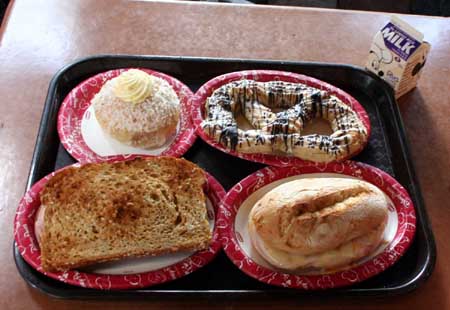 Kelli ordered a chocolate Kringla Sweet Pretzel and the Ham and Apple Sandwich- ham, apple, Jarisberg and muenster cheese with a sweet apple chutney on toasted bread. They were able to switch the bread to a ciabatta, as she was worried about what was in the whole grain it normally comes on. I had the Norwegian Club Sandwich - turkey, ham, bacon, Jarisberg and muenster cheese, with tomatoes, red onions and lingonberry mayonnaise on toasted multigrain bread; plus the School Bread.