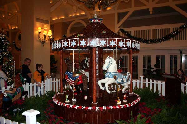 We went out later to view the finished gingerbread carousel in the Beach Club lobby and share a dessert at Beaches and Cream. We didn’t want to get stuffed and the 2-scoop hot fudge sundae was just the right size to share.