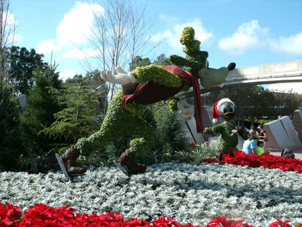 We again slept in but were out of the villa by 9. It’s nice not to be rushing to get ready everyday on a vacation. We wanted a laid back day so decided to check out the monorail resorts. We headed to Epcot and since it’s only a 5 minute walk away we were there just after opening. We headed straight for Soarin’, grabbed fast passes and rode. Living with the Land had a short wait so we rode that. There were a few different things fruiting since we rode last spring. We stopped at the Art of Disney on the way out to the monorail. We were temped to by a few of the more expensive items but decided not to. It is still a nice store to explore and look through. There were holiday topiaries in front of Spaceship Earth which featured Donald and Goofy skating.