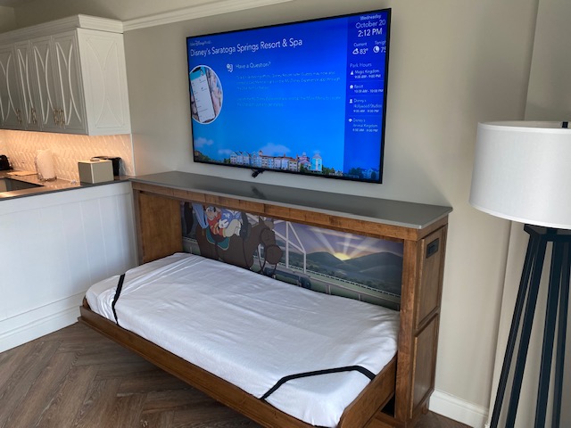 We decided to have a light lunch at Artist Palette and shared the kids’ meatball meal. We then drove over to the nearby Publix for milk, eggs, bacon, cereal, a case of water, some diet soda and some snacks. We drove back to the Congress section of Saratoga Springs Resort and found our newly refurbished one-bedroom villa #2434. This now sleeps five instead of four with a pulldown standard behind the couch and a single pull down under the TV. Both reveal painted murals featuring Mickey, Minnie, Donald and Daisy, Goofy and Pluto relaxing in front of a house and Goofy relaxing on top of a racehorse. The whirlpool tub is gone, replaced by a deep soaker tub, which we used later in the week. A new mirror features two hidden Mickeys. Our balcony had a great view of the water and Disney Springs. We relaxed in the room to avoid the heat till dinner.