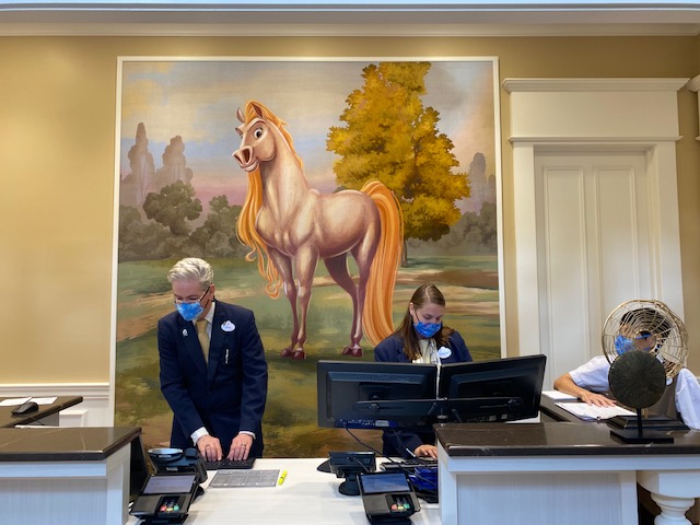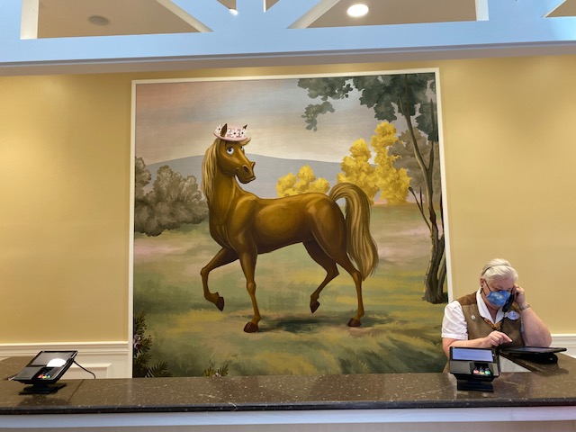 The new lobby is adorned with huge murals of Disney Horses. They included; Frou-Frou from “The Aristocats,” Philippe from “Beauty and the Beast,” Merida’s horse Angus from “Brave,” baby Pegasus from “Hercules,” Maximus from “Tangled,” and Destiny from “Enchanted.” If you don’t remember “Enchanted,” it’s a live action/animated self-parody film starring Amy Adams and Idina Menzel. Animated characters end up as real people in NY. Instead of bluebirds and deer helping with Cinderella’s chores, Giselle has New York rats and pigeons help.