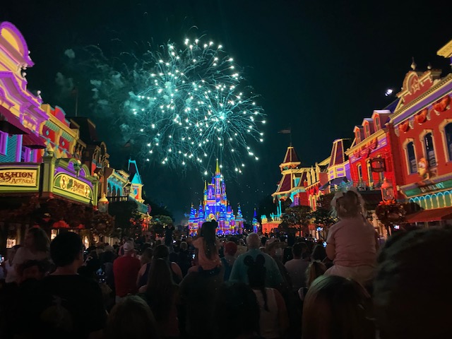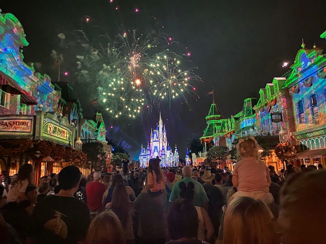 We left for the Magic Kingdom at 6:45 to make it to the new nighttime fireworks and projection show. We were on Main Street 35 minutes latter taking some photos. I guessed that the best place to see both the fireworks and the new projections along main street was about 2/3 the way up, just past the last “side street.” It was the perfect spot! Enchanted started at 8PM and we both loved the new show. I can see that it can get mixed reviews if you don’t also see the new Main Street projections.