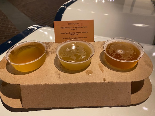 At Hops and Barley, we had the Hot Beef Sandwich with horseradish cream and pickled vegetables, and I tried the Beer flight: 81 Bay Brewing Co Strawberry and Lime, SweetWater Brewing Company Hazy IPA and a Lord Hobo Brewing Boom Sauce DIPA. The IPA and the DIPA were way too hoppy for me, the strawberry beer was sweet, interesting and refreshing.