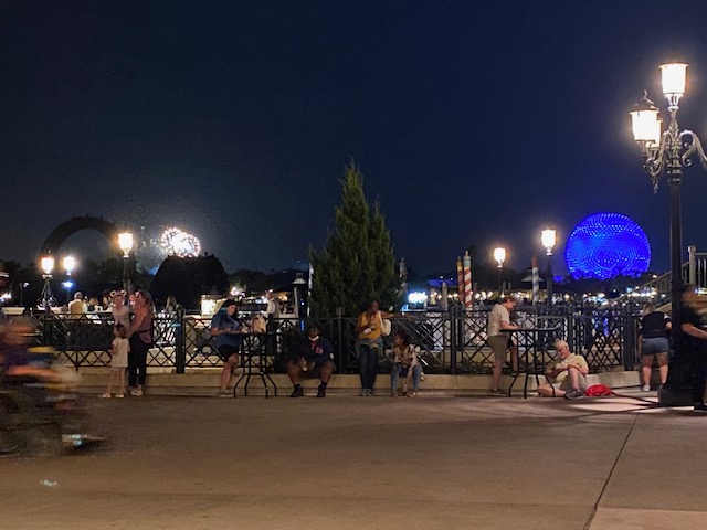 We found a spot to sit and relaxed in Italy. We started to see distant fireworks coming from the Magic Kingdom. We noticed a huge White ibis roost as we passed over the bridge between Germany and China. Their white bodies dotted the trees along the water.