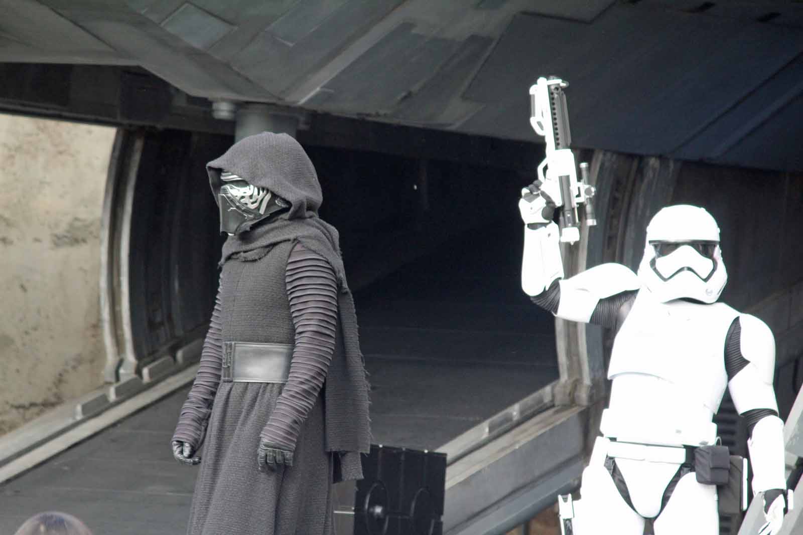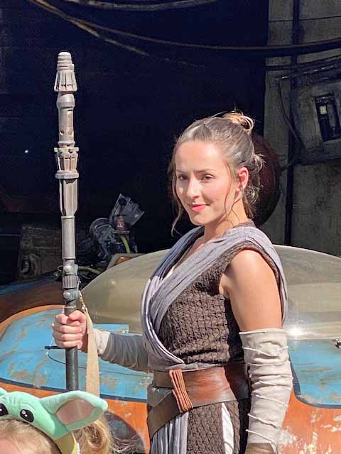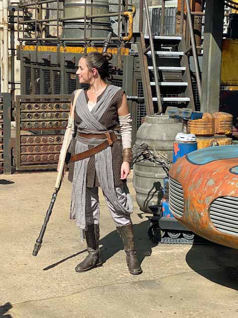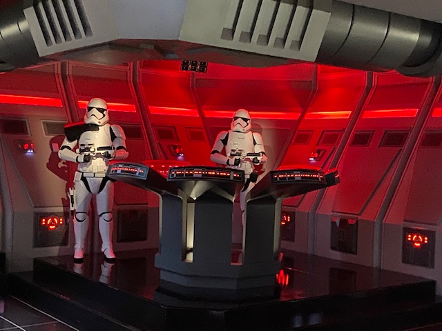We then posed for some Star Wars photo pass photos. We relaxed near the entrance to Star Wars: Galaxy Edge. Both Rey and Chewie were out at the Speeder Repair Garage and we refreshed ourselves with some blue and green milk. We passed by the storm troopers guarding the First Order TIE echelon ship (TIE Fighter.) We also saw a resistance fighter sneak up on top of the building to spy on the First Order. Keep your eyes open around here. You never know what you might see.