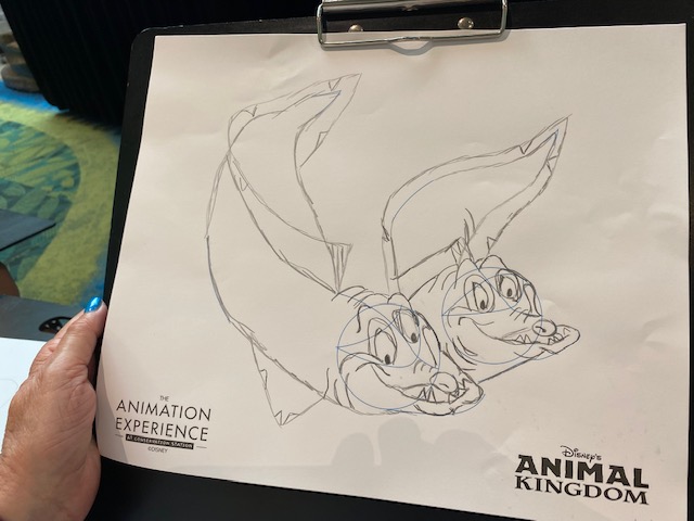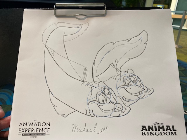 We took the Wildlife Express Train to Conservation Station. Along the way we got to see a baby rhinoceros! I had also made a LL pass for The Animation Experience for 11:30, but again it was not needed. They didn’t even fill every seat. What you get to draw changes with every class. Kelli and I got to draw Flotsam and Jetsam from the Little Mermaid. You start out with sheets of papers with some guide lines which helped make it a bit easier. Both of ours came out ok after the 30-minute class. I saw that the next class drew a snake.