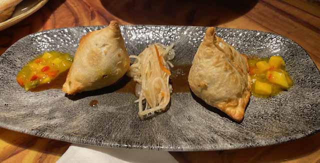 I tried the Kande Coconut Cooler - African rum, coconut, vanilla ice cream and orange juice. We enjoyed only appetizers including the Indian-style Bread Service: Five Breads with all Nine Accompaniments - Traditional Naan, Garlic-Ginger Naan, Spiced Naan, Onion Kulcha, and Paneer Paratha. Accompaniments - Cucumber Raita, Roasted Red Pepper Hummus, Mango Chutney, Tomato-Date Jam, Tamarind Chutney, Coriander Chutney, Garlic Pickle, Red Chile Sambal, or Spicy Jalapeño-Lime Pickle. I also enjoyed the Potato and Pea Samosas with tamarind and mango chutney, and Kelli tried the Seasonal tomato and cheese soup.