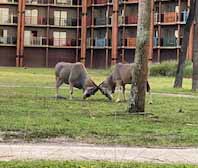 After dinner we went outside to view the animals. They were very active. Two male Common Elands (Taurotragus oryx) locked horns and duked it out. Reticulated Giraffes (Giraffa camelopardalis reticulata) strolled around and a Crowned Crane (Balearica regulorum) danced by.
