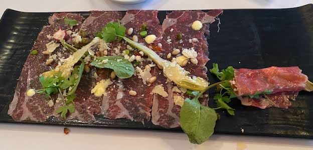 I drove us over to the Yacht Club resort to the Yachtsman Steakhouse for Kelli’s Birthday. Our waiter was great and suggested the carpaccio as an appetizer. The Beef Carpaccio with truffle aioli, parmesan, fried capers, grilled artichoke and smoked sea salt was the highlight of the meal. The bread service included roasted garlic. I had the watermelon margarita.