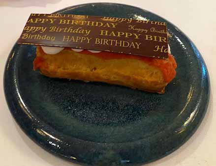 We both had the 8 oz Filet Mignon with either haricot vert or potato-leek gratin. The restaurant brought out a Birthday éclair for Kelli, but we still shared the Crème brulee with pickled blueberries, blood orange and candied Meyer lemon.