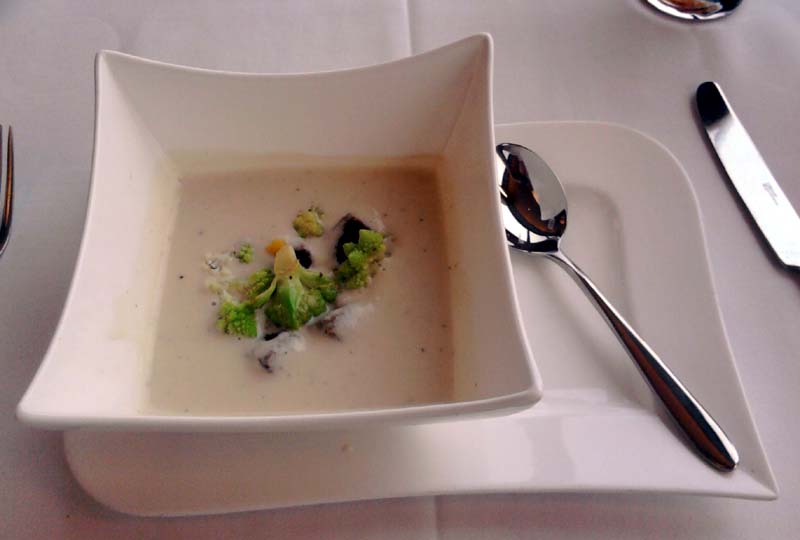 Dinner was at the California Grill. We were seated next to the window but away from the Magic Kingdom, but with nice view of the water bridge and Seven Seas Lagoon. For starters we had the Vidalia Onion Tart (red onion marmalade, heirloom tomato ketchup, sweet onion rings) and the Roasted Cauliflower Soup. Both were good though Kelli did comment that the tart was quite salty. I also ordered a Belgium Beer. I liked it so much I ordered a second later.