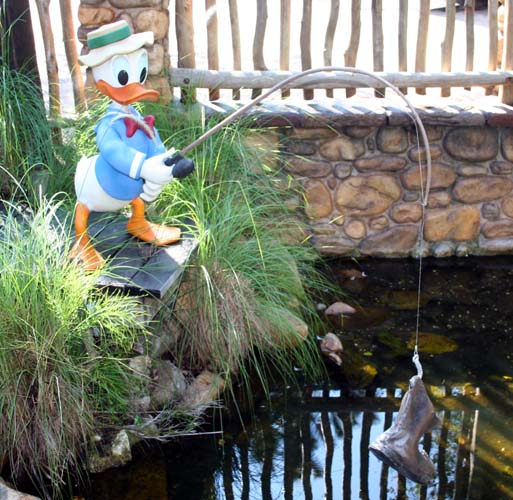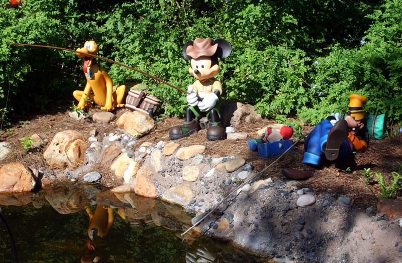 We headed to Animal Kingdom by bus with a short wait, but then the bus stopped at the Wilderness Lodge, the Polynesian Resort, the Grand Floridian and then Blizzard Beach on the way. We were still in time for the first showing of the Festival of the Lion King. We took new pictures of Daisy Duck hiking with Huey, Dewey and Louie along the stream. A few mallard ducks were sleeping next to Daisy. Then we finally found the “fishing hole” where Mickey, Goofy, Donald and Pluto are fishing. We’ve always missed them since we cross the bridge at the Lion King on the right side going in. They are on the opposite side of the path from Daisy and the three boys.