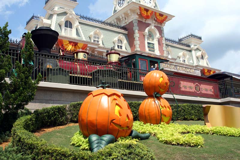 We headed back to the room to change into more comfortable clothing along with rain jackets and umbrellas. There was a light sprinkle of rain on the walk over to the Magic Kingdom, but it stopped by the time we reached the front gates. Many of the Halloween decorations were already up.