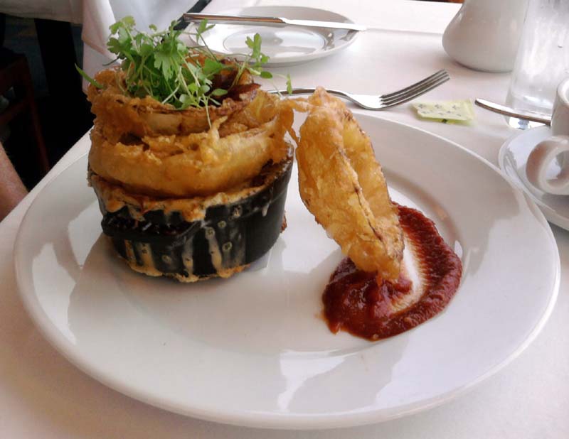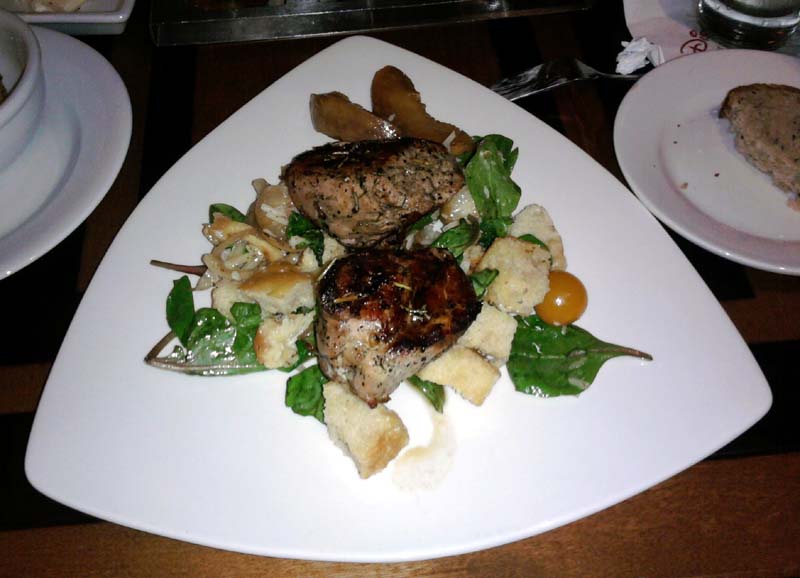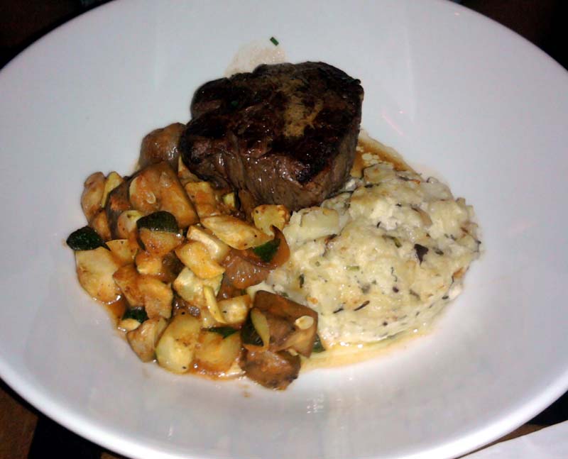 At first the menu seemed blah, but our waiter pointed out the beef and pork tenderloins as being excellent. Kelli ordered the Grilled Beef Tenderloin with Shallot Butter, Potato Gateau, and Spring Ratatouille and I the Locally-sourced Thompson Farms Pork Tenderloin in a Charred Herb marinade with Bread Salad and Bourbon-grilled Florida Peaches along with a Side of Potato Gateau with Goat Cheese.