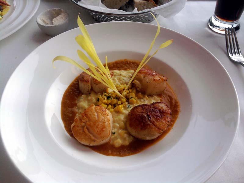 For our entrées Kelli had the Roasted Organic Chicken (sweet corn cake, corn purée, petite carrots, chipotle emulsion and I had the Seared Diver Scallops (southern sweet corn risotto, spiced tomato broth, micro popcorn shoots).